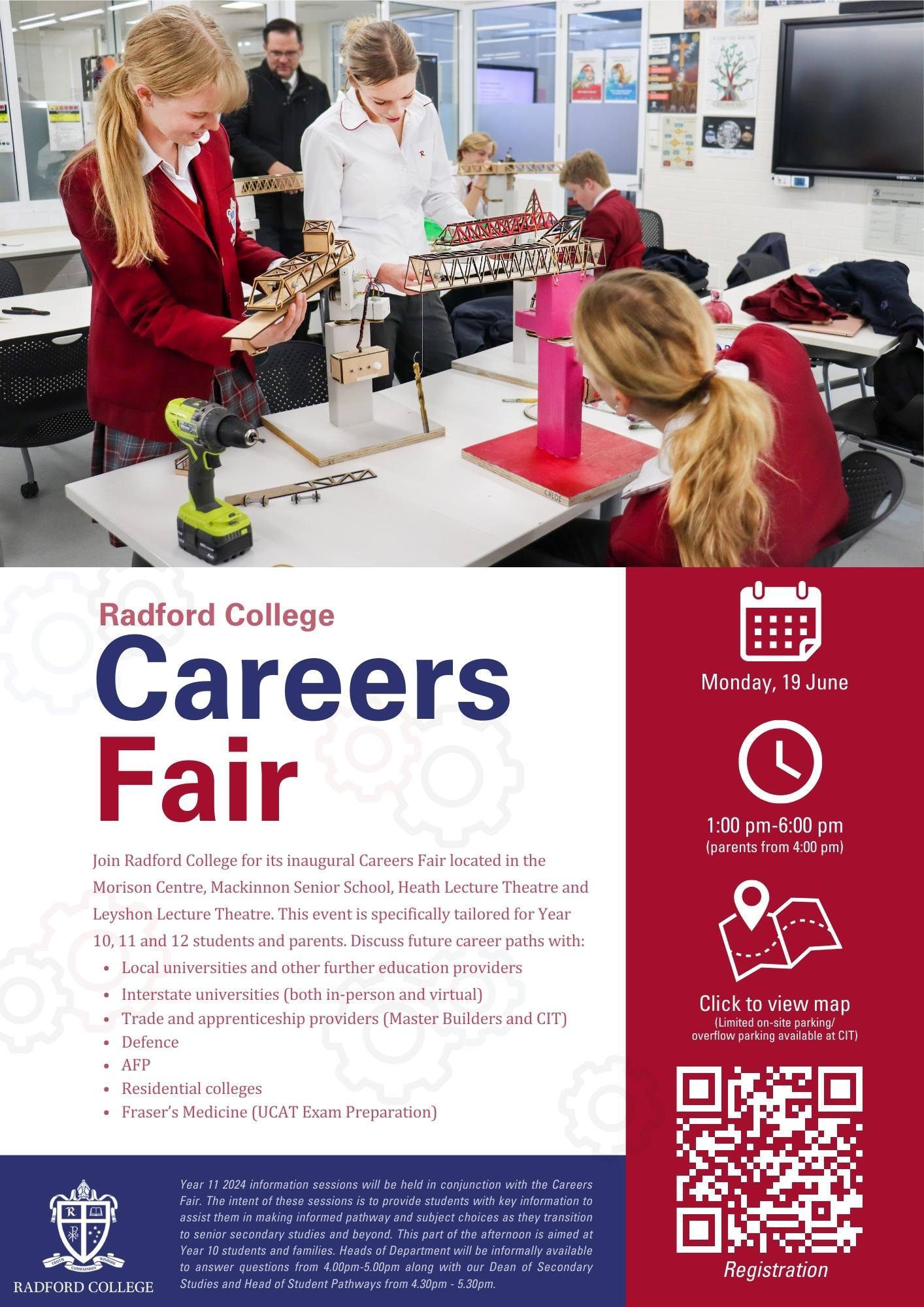 Join Radford College for its inaugural Careers Fair located in the Morison Centre, Mackinnon Senior School, Heath Lecture Theatre and Leyshon Lecture Theatre.
