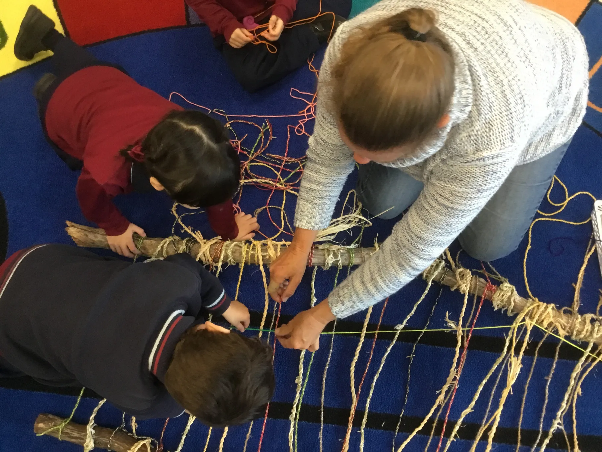 We weaved this all together. We did this by listening and doing. We worked together. We gathered things. We walked in the bush. We found feathers. We used the string going over and under. It’s about the stories we read, Lilah and Leonard the Lyrebirds (by Jodie McLeod). When we finished the weaving, we voted to name it Rainbow String. And that’s the whole story.