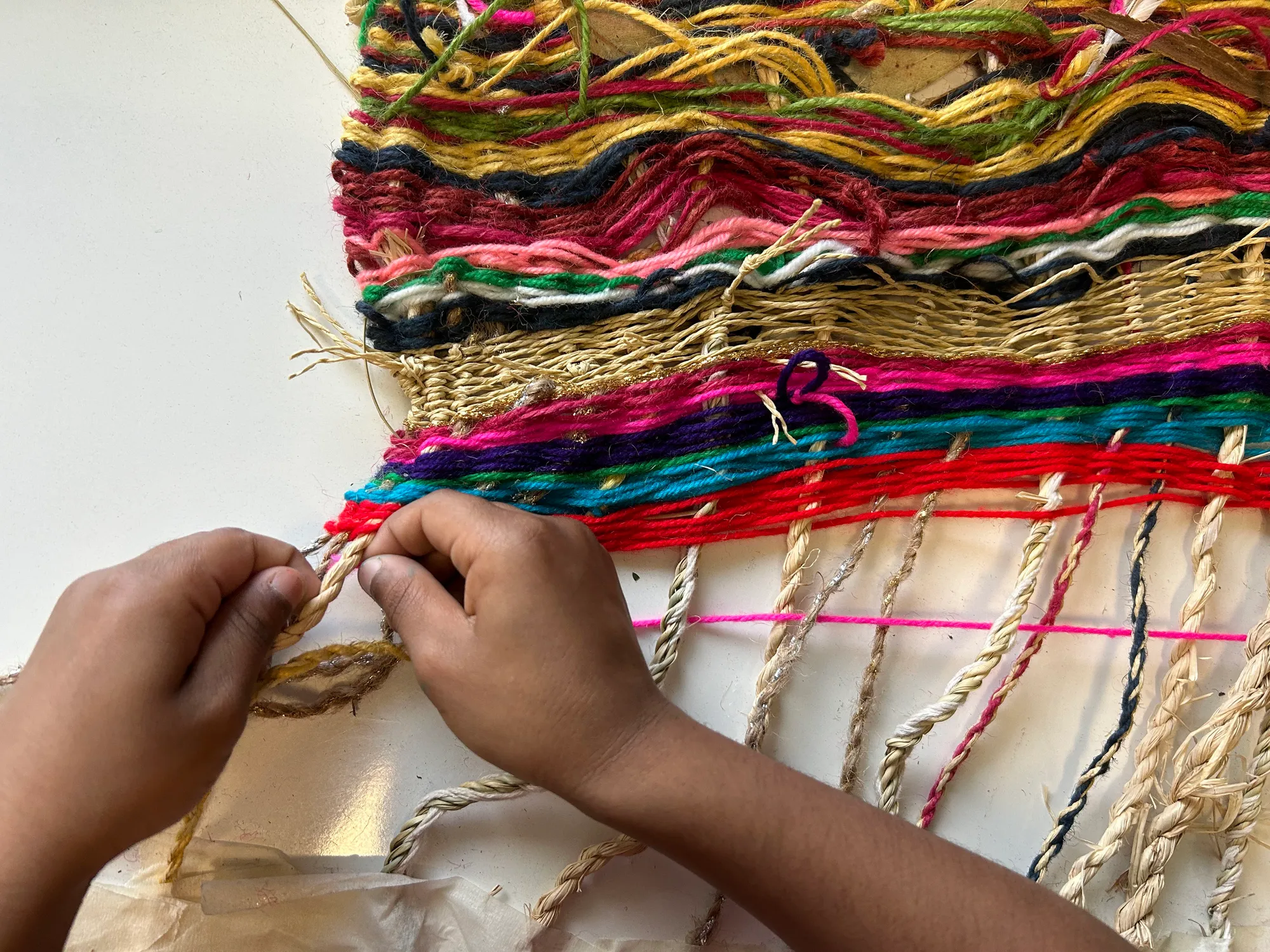Lomandra, a native grass growing in the gully, was dyed using gathered fallen bark, and then plaited to form the warp. Whilst the weft was woven from natural and man-made materials. Students wove the work across the year, finishing with celebratory gold and silver. Feathers gathered all year long fringe the work, completing an inquiry from the beginning of the year on their form and function, their collaborative ability to enable flight.
