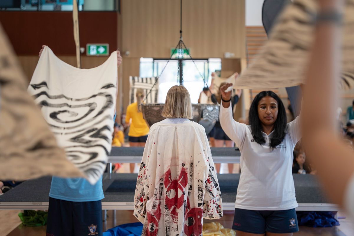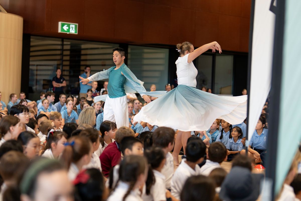 And the audience certainly would have heard the energy: the stomping of feet, the rhythmic drumming from Year 10 student Rubin Leach and the Junior School students creating the sounds of nature—rubbing hands to mimic wind, rustling bags for rain, shaking rice instruments and clicking fingers. The musical landscape was rich and diverse, with moving sounds of the didgeridoo and clapsticks by Duncan and Jakida Smith of Wiradjuri Echoes; performances from the Chorale choir, with Year 11 student Natalie Tam on piano; and the band, Is the Ocean a Soup.