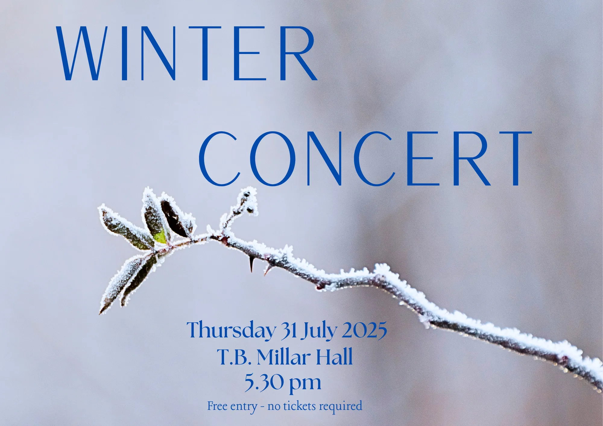 - Winter Concert – Thursday, 31 July – 5.30 pm – T.B. Millar Hall – Free entry, no tickets required