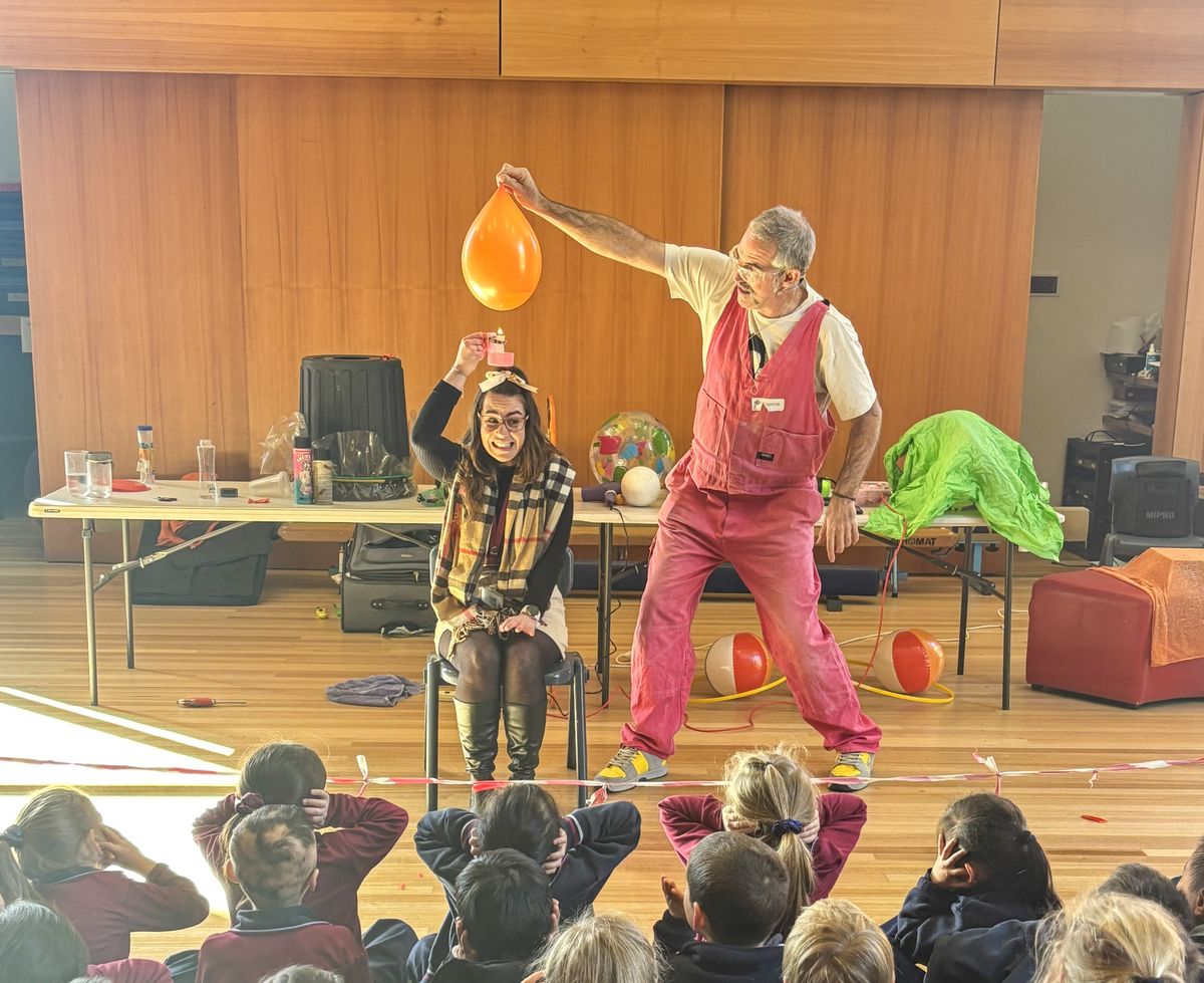 Lots of gasps, giggles and squeals of delight were heard as Dr Walker demonstrated scientific experiments using household items such as ballons, a leaf blower, a vacuum cleaner and a rubbish bin. The students were hanging on his every word.