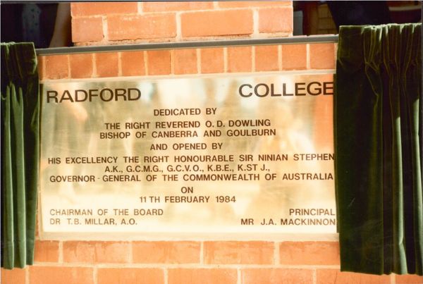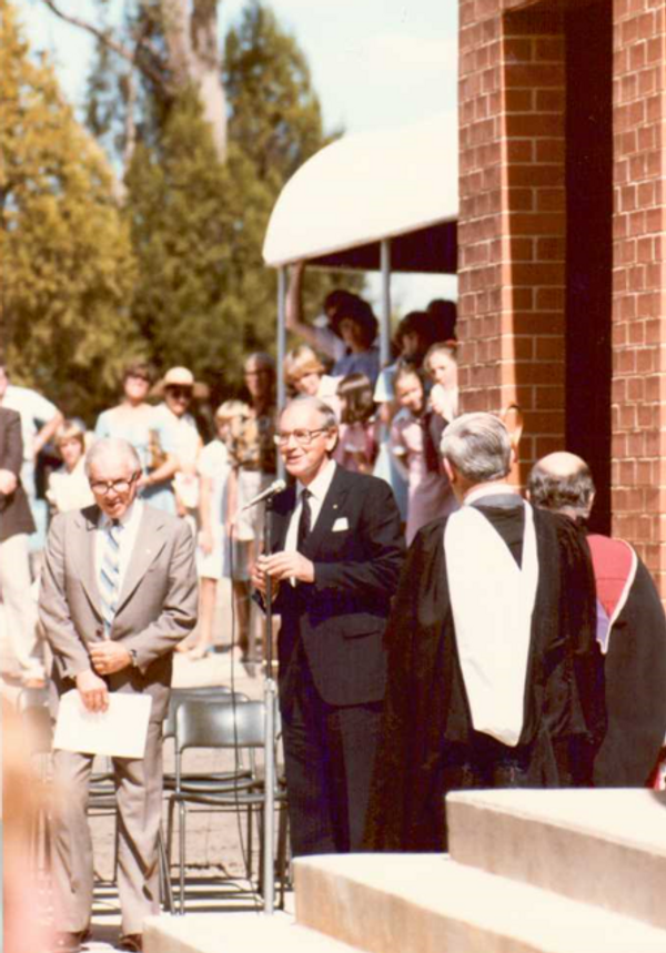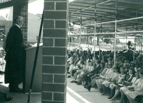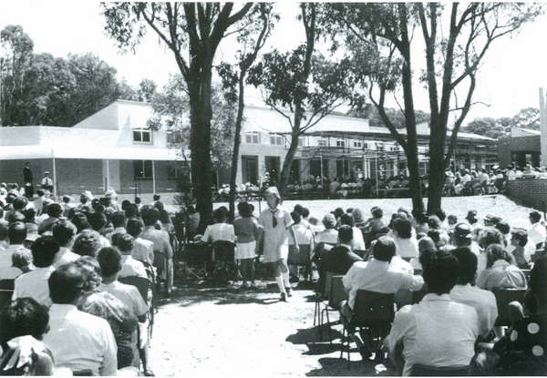 Among the official guests were The Right Honourable Sir Ninian Stephen, Governor-General of Australia and the Bishop of Canberra and Goulburn, The Right Reverend Owen Dowling. It was a warm Saturday, and students were dressed in full summer uniform. The Official Party was seated on the stage and other visitors sought shelter under the marquee and the shade of nearby trees.