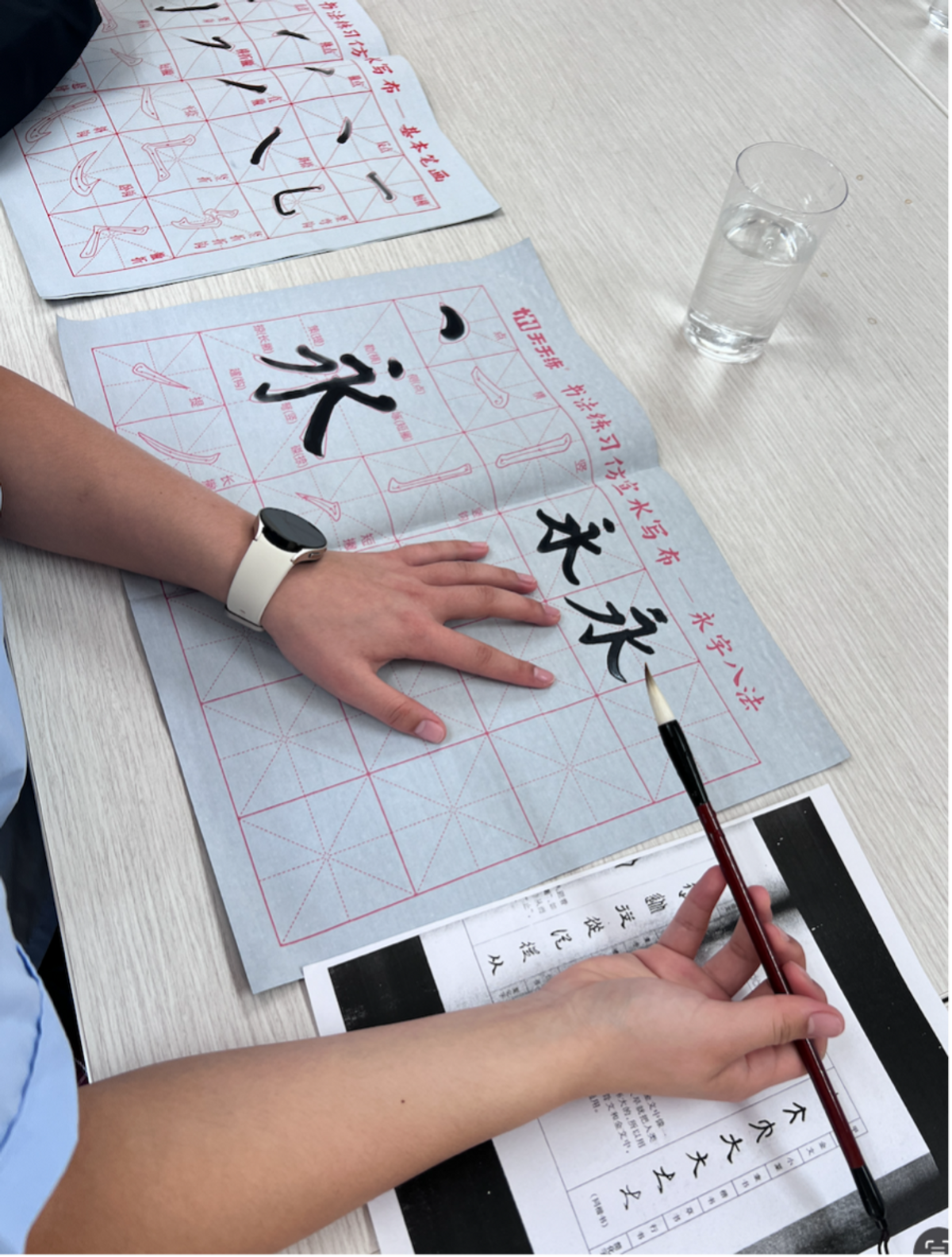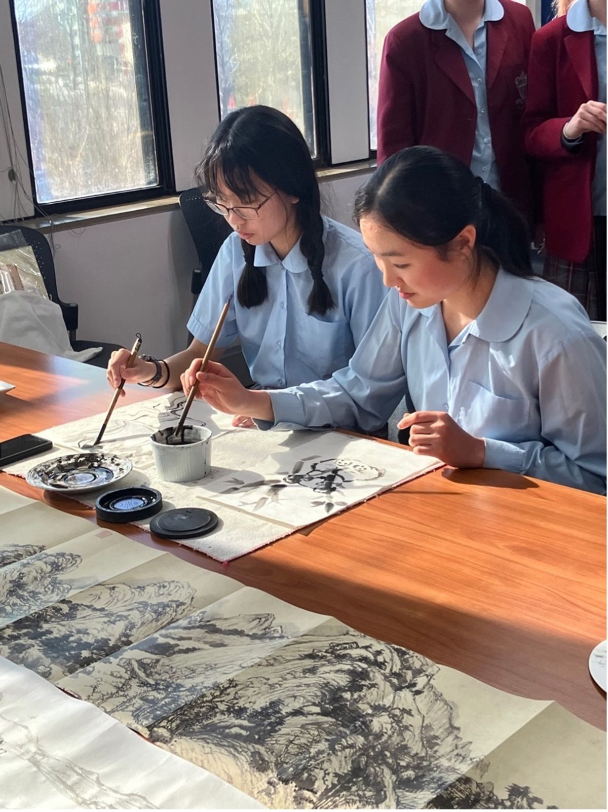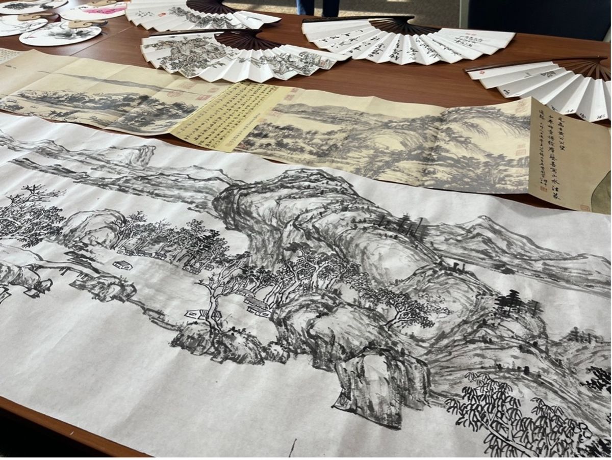 The afternoon concluded with traditional Chinese calligraphy and ink painting, where students had the opportunity to engage with these traditional art forms. From the instructors, students learned the history of calligraphy and many characters, such as 木 (tree) and 目 (eye), and their evolution into what they are today. Alongside calligraphy, students explored the world of traditional ink painting. They experimented with various brushstrokes to create expressive artworks depicting natural landscapes and animals.