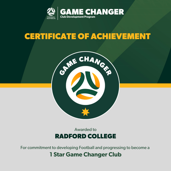 Radford Sport - more specifically our Football Program - is excited to announce that we have been announced as a 1 Star Game Changer Club. Radford's Football Program is the first in Canberra to be awarded this level and has also been named as Club of the Month by Capital Football.
