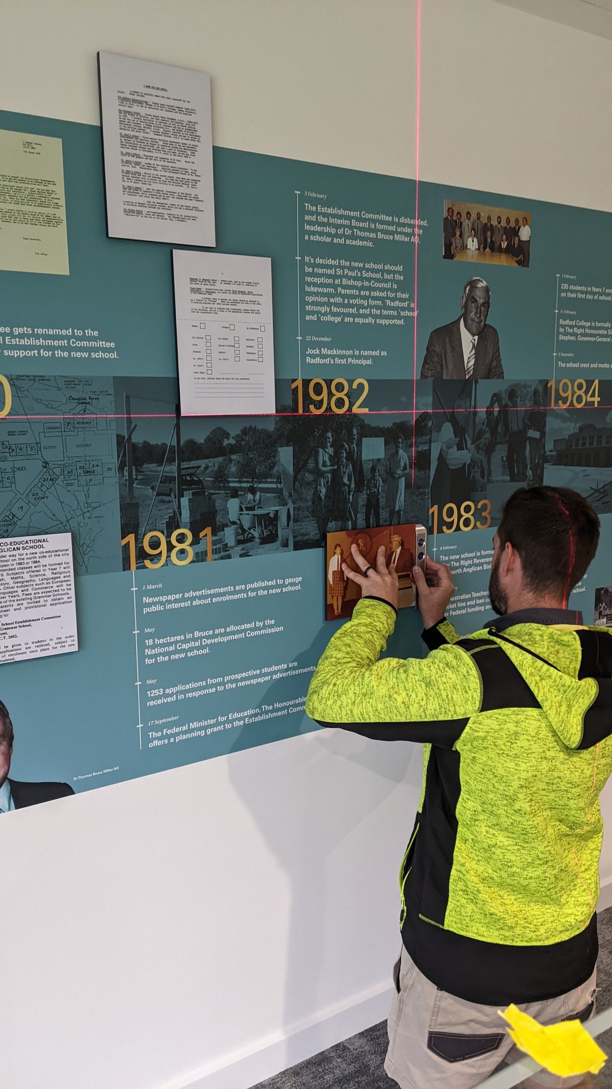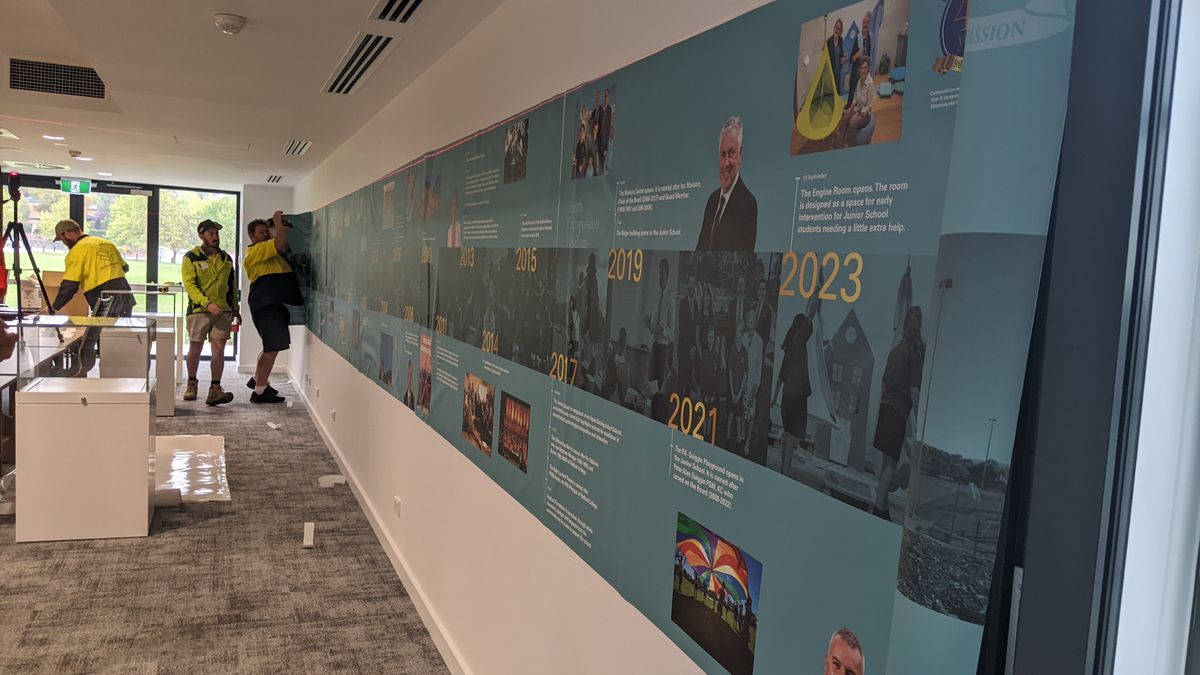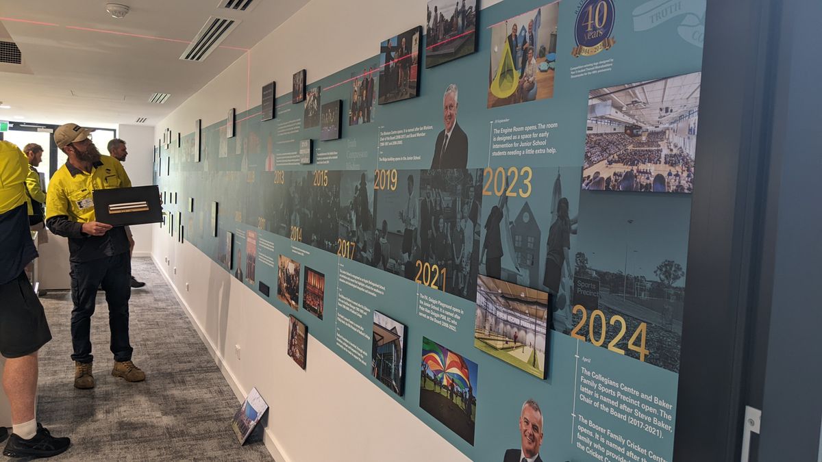 Following a successful preview at the Gala Ball, the Radford College timeline was installed in the meeting room of the Collegians Centre on Tuesday. It is now ready for the official opening of the building as part of the Foundation Day celebrations. With 113 images and 1126 words, this 18-metre timeline records the significant milestones and special occasions of Radford College’s history.