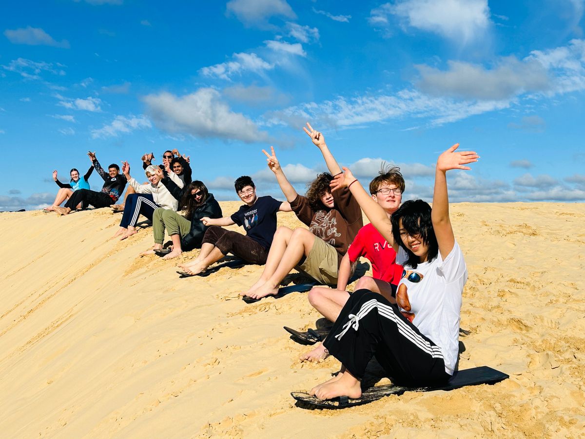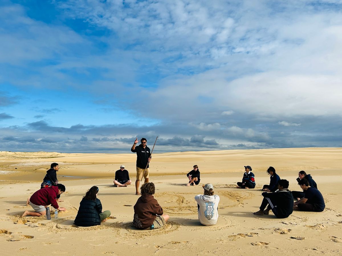 Day 2 got off to a great start as the group sat in awe of the mesmerising sunrise across Stockton Beach. We then travelled to Birubi Beach and met Peter and Antoine who took us out to explore the area. They presented the clever way First Nations Peoples inhabited Australia. For example, we learnt how we could easily find fresh water on the beach. But the most important messages that Peter shared with us is how First Nations People connect with the environment. Land is seen as sacred, to such an extent that it is referred to as "mother". Mother provides a plethora of resources that are crucial to survival and thus it is our responsibility to take care of land as if it is our mother. However, this is not the happy reality of Australia. At numerous cultural sites, we saw tyre marks through them and piles of rubbish. This highlights the careless attitude of our society towards the environment. After the workshop, went to the high sand dunes where we had a terrific time and conquered our fear of heights. After running up the dunes so much that our calves felt like jelly and having so much sand on us that we felt like sandpaper, we drove away and headed towards Nundle.