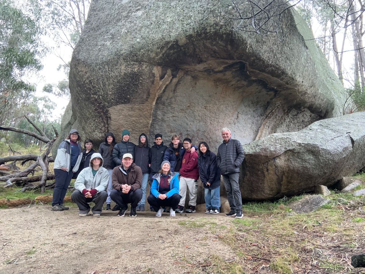 Day 3 started with a meeting with Len Waters, a Kamilaroi man, who told us about stories and culture. He told a story about how humans caught a big fish and how all the fish we have today come from humans cutting up parts of that large fish and throwing it in the water. Len also talked about how a crocodile burrowed through the land and created rivers and valleys. After he told us these stories, he helped us make hand paintings out of ochre and water. He then took us to visit Boundary Rock at Moonbi. The rock art shows the meeting place between the elders of the Anaiwan and Gomeroi tribes, and how boys become men in Aboriginal culture. The painting is at least 700 years old and was made by using ochre, animal fat and blood.