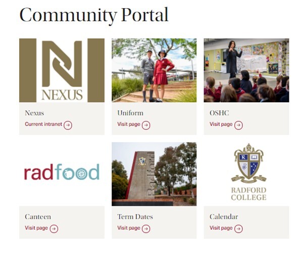 We had previously advised that the Community Portal tab and page on the College website will be replaced by a Nexus tab and that resources for parents including uniform, canteen, OSHC, term dates and calendar will be available inside Nexus. However, it has been decided to leave the Community Portal page active for a few more weeks and replace the Radford Online tile with a Nexus tile.