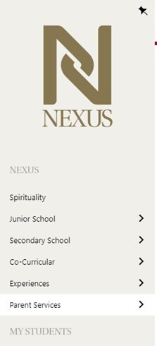 During the transition phase, we encourage parents to start accessing Parent Services inside Nexus via the menu on the left-hand side of their dashboard (Nexus homepage) or by using the Quick Links on the bottom right-hand side of their dashboard.