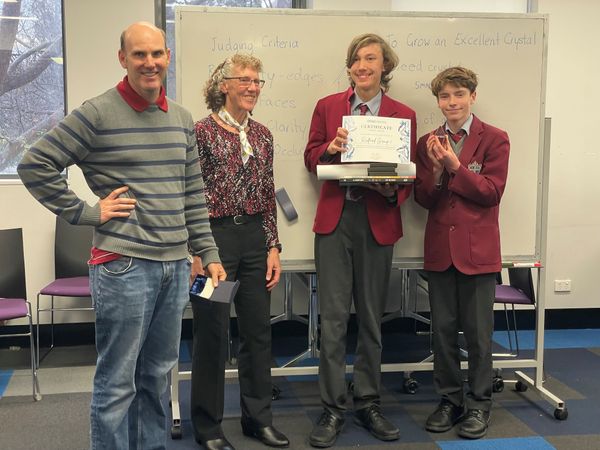 Crystals were submitted for judging at the end of July, and we are happy to announce Infinity Science Club won two awards! Ethan Waters, Miles Greig and Tommy Charlton won First Prize for Years 9 and 10, while Tharun Kumar, Milaan Gera and Liam Judd won the prize for the biggest crystal. Both teams attended the Awards Ceremony at the Australian National University’s Crystallography labs, with a talk from Lesli Findlay, the lead judge and a crystal growing expert, on judging criteria and how to make the perfect crystal. Students were handed their awards by Dr Trevor Rapson, a Senior Research Scientist at CSIRO and the Head Crystal Competition Organiser. Students were then treated to a tour of the Crystallography lab facilities and how crystals just like theirs can be studied using state of the art equipment.