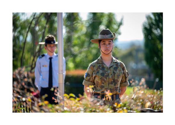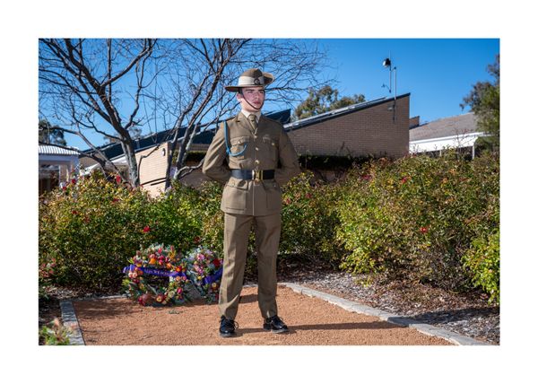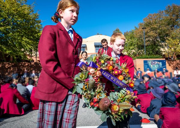 Following the speeches, Deputy Principal and Head of Secondary School, Mr Bradley Cooney, read The Ode. Bernstein Symphonic Wind Orchestra then played Canon of Peace, arranged by Paul Jennings and conducted by Director of Bands Mr Ben Marston, as students laid wreaths. This moving moment that honoured those who have fallen was proceeded by a minute’s silence, while Year 12 student Lachlan Gaden played The Last Post on the bugle and Defence Force Cadets Xavier Sassu, Isaac Walker, Emily Passlow and Erica Li raised the flags.