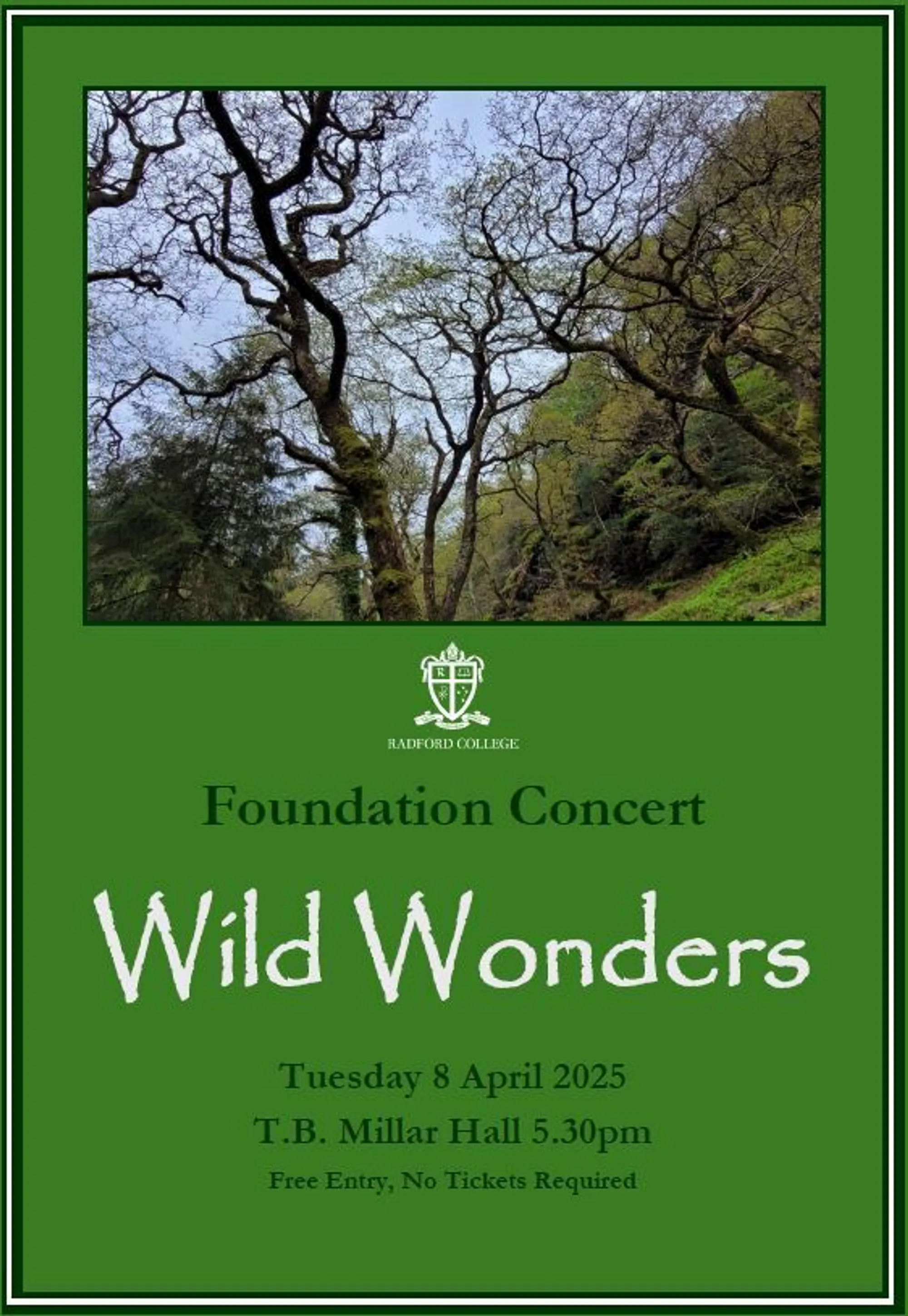 The Foundation Concert this year, entitled Wild Wonders, will be held in T.B. Millar Hall from 5.30 pm on Tuesday, 8 April. You are invited to join us for an evening of music exploring nature, the environment and other interpretations of what it is to be wild.