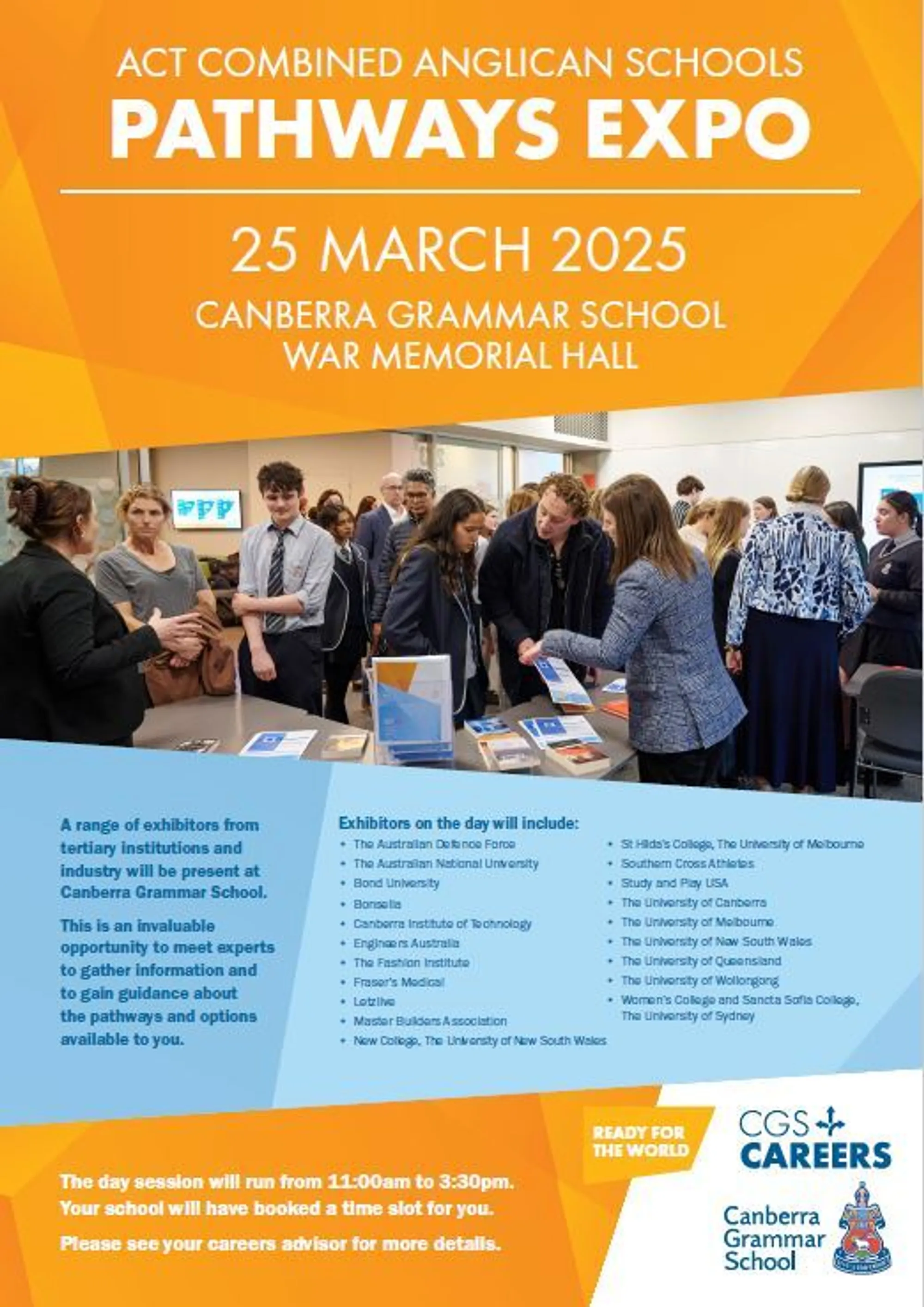 We are excited to invite students in Years 10–12 and their families to attend the evening sessions of the upcoming Combined Anglican School Pathways Expo hosted this year by Canberra Grammar School. This is a fantastic opportunity to explore various educational and career pathways with leading institutions.