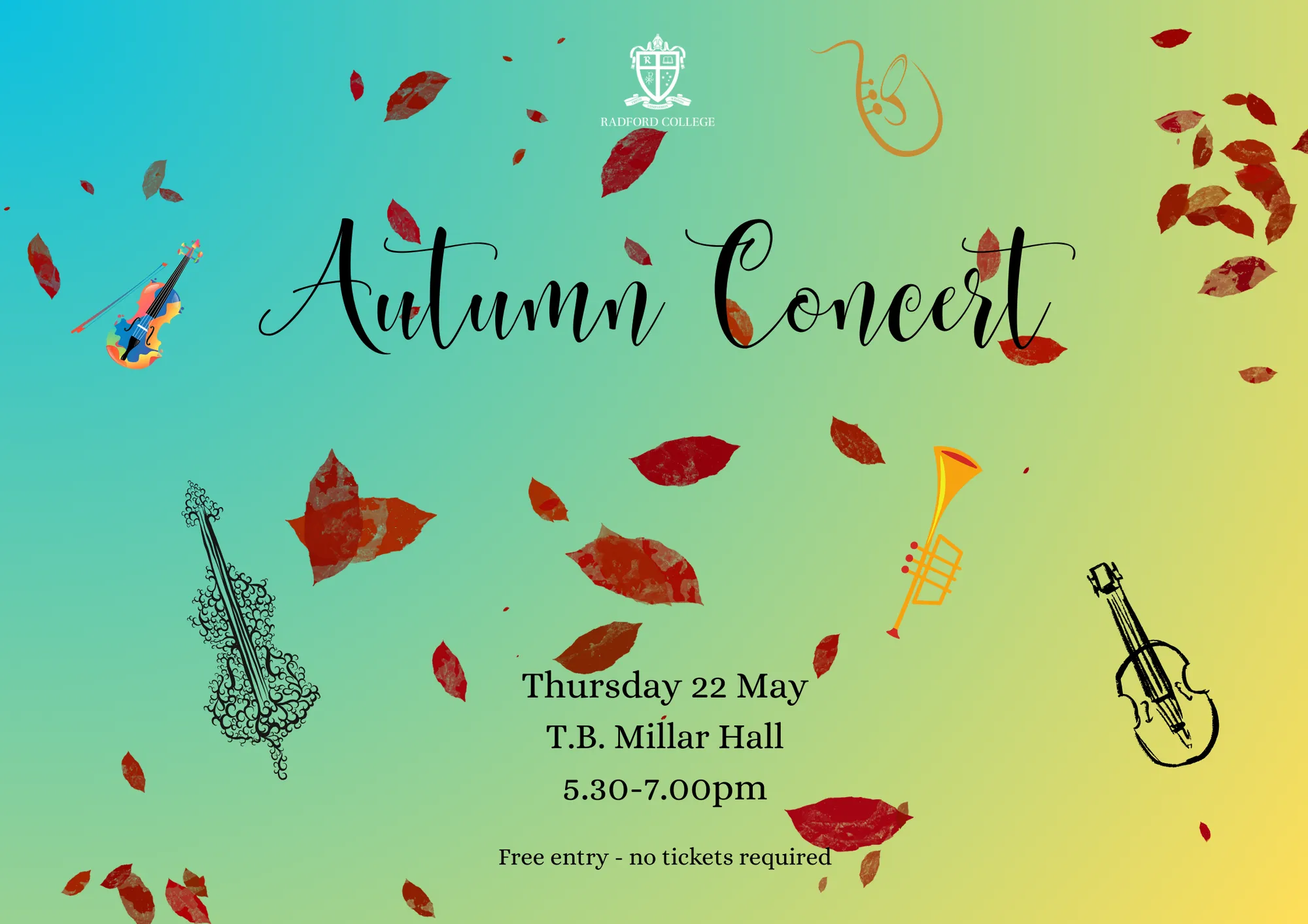- Autumn Concert – Thursday, 22 May – 5.30 pm – T.B. Millar Hall – Free entry, no tickets required