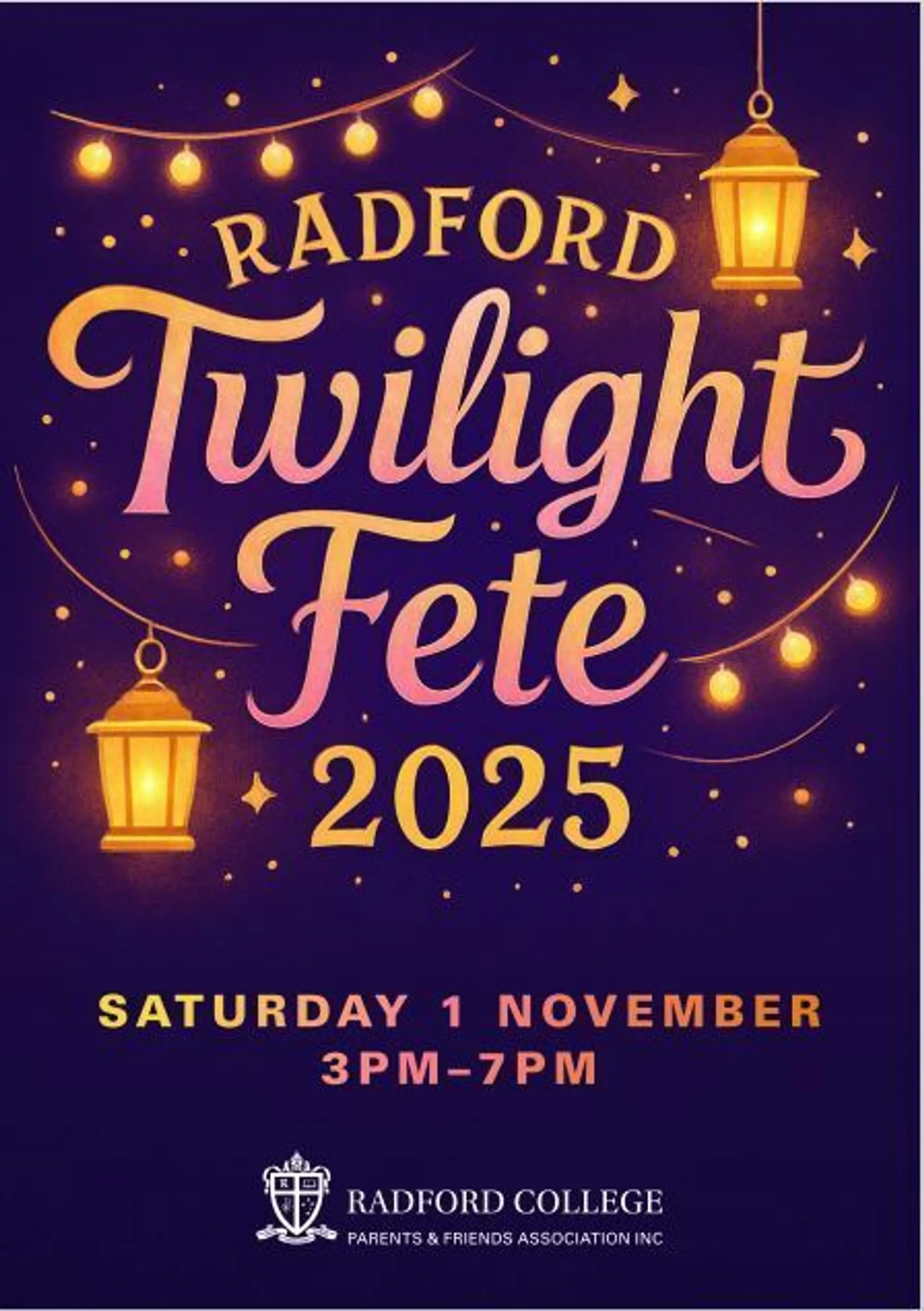 - Radford College Twilight Fete (save the date) – Saturday, 1 November – 3:00 pm to 7:00 pm